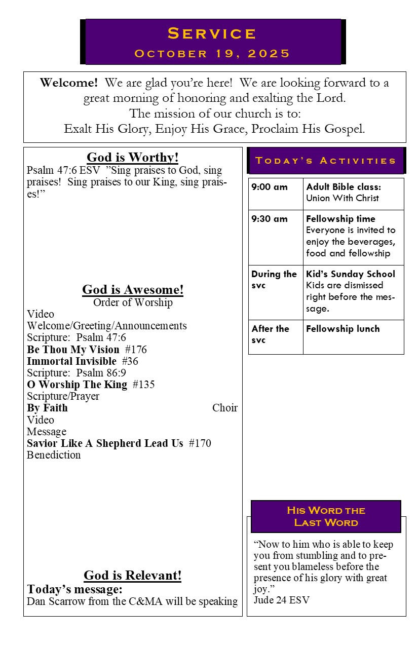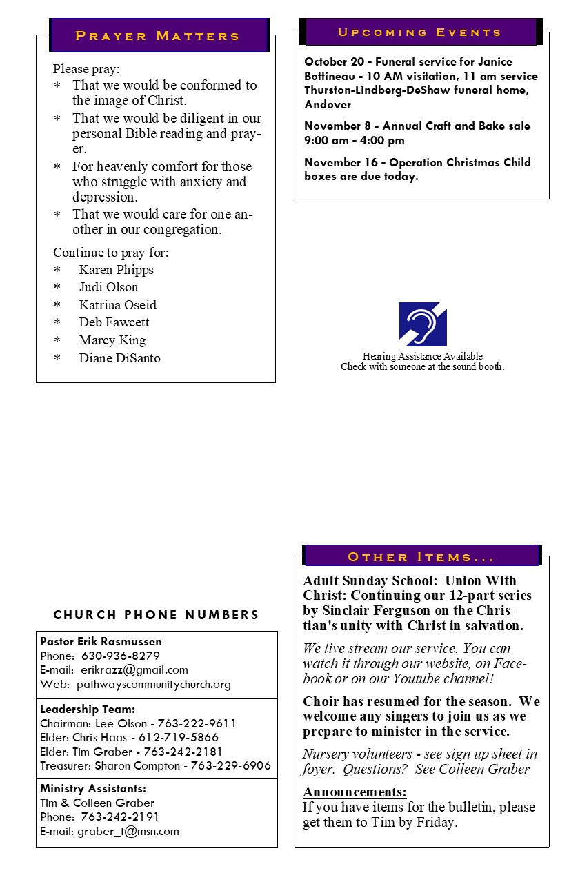 Join us as we install our new pastor, Erik Rasmussen. Pastor Dan Scarrow from the North Central District of the Christian and Missionary Alliance will be speaking and officiating the installation. If you are able to come in person, great! You will be able to meet Erik and his family. If not, you are welcome anytime!